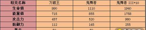 作为A系坦克,能量是不可缺少的重要属性。A系坦克固然有其他坦克没有的诸多控制手段,可是对能量的需求也不是一般的多。所以说,要分辨一款A系坦克的优劣,首先要看它的能量储备。下面我们就一起看看鬼舞者的基础属性,为了让大家更清楚的看到鬼舞者的优势,小编特地将老牌A系坦克万磁王和鬼舞者的属性放在一起做了个对比:
