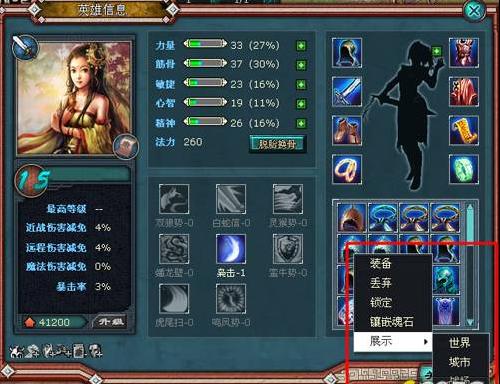 打开主英雄界面,右下角将清晰的列出所有装备,点击装备,会弹出一个窗口,其中包括装备、丢弃、锁定、镶嵌魂石、展示五个选项。在展示选项下有世界、城市、战场、联盟四个选项,选择不同的场景,可以向不同的人群展示装备。
