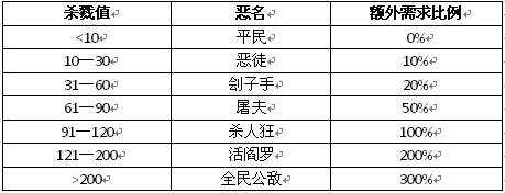 玩家们把鼠标移动到游戏界面左上方的“恶名”,就会显示玩家当前的杀戮值、征兵价格和产生时间的比例情况。在非随着玩家们攻击对方玩家的次数越来越多,杀戮值就会自动提升。玩家PK同等段或者更高等级段的玩家不会增加杀戮值。PK比自己等级要低的玩家将会以1点为单位逐步提升: