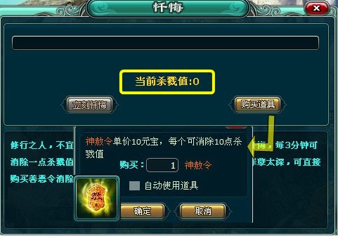 2、道具消除杀戮值:玩家们可以直接在元宝商店购买“神赦令”,直接使用消除10点杀戮值;