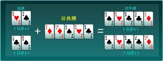游戏规则: 从底牌和公共牌中选出最大的5张牌,组成“成手牌”,与其他玩家比较,牌型最大的玩家胜出。 在上图中我们可以看出,玩家A的成手牌有两对,而玩家B有一对,根据比牌规则“比牌不分花色,从大到小比牌。若依次比完大小相同,则均分注码池内的注码。