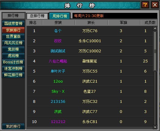 2010年1月1日宗族战结束后,宗族排行榜的周排行榜上,排名前三和十二名、二十五名的宗族丰厚奖励。