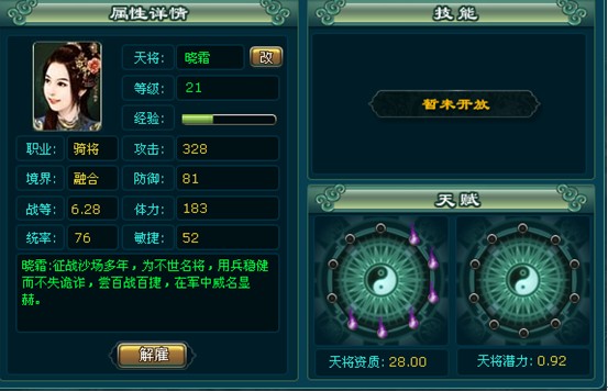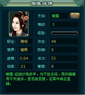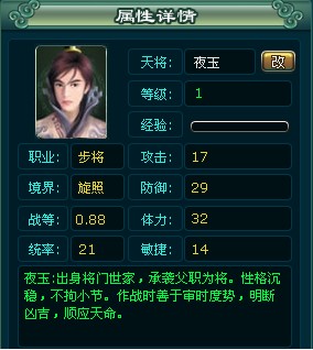 上图是一个表面看起来资质很平凡的绿将。那么这个将领应不应该培养呢?那么第二我们应该考虑的就是天将的属性了。据colin一直以来的招募天将的经验,结合游戏心得,我发现:步将看,防御和体力,满防为30,满体为32(1级白将或绿将,以下相同);骑将看攻击和体力,满攻为50,满体为29;弓将看攻击和敏捷,满攻为25,满敏为42;法将看攻击和敏捷,满攻为45,满敏为20;飞将看攻击和敏捷,满攻为28,满敏为32.这样看来,上图的骑将攻击差2接近满攻,还不错;体力21比较低,4个属性加起来86,根据我看过的最低4属性和75,最高4属性值98来说,86可谓是中间水平,但是,这样的水平中,这个天将的战等居然有0.84(我看过最高的1.08,最低的0.52),稍微排得比较靠前,根据天将的资质影响天将的基本属性,所以可以估计,这个绿将资质应该不低。我升到21级,一看: