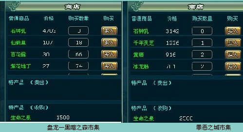 我们可以很清楚的看出两家市集的商品价格对照,在没特产的情况下,从罪恶之城购买石钟乳卖给黑暗之森的市集,可以赚1500多元。不过刚接任务时只有2000快,不够买一个石钟乳的钱,那么我们只能再去别的市集看看物品价格或者等待商品的刷新(商品5分钟刷新一次)。
