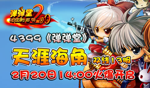 Q版游戏之王4399《弹弹堂》双线13服于今日下午14:00全面开启,这款万人同时在线弹战竞技的Q版休闲网页游戏又将用华丽的画面,精巧的装备,可爱雷人的造型为大家献上新年之后的新欢乐。届时,玩家只要已登录就可获得价值500RMB的强悍道具,并可以在各种活动中赢取高额奖励。