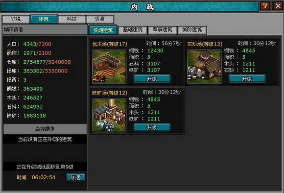 1、资源建筑:包含伐木场、石料场、铁矿场,升级就可以提高资源的采集效率,让你的税收来得快些,不过个人认为这一栏是鸡肋,在游戏中衡量玩家实力的是你的军事水平而不是资源能力,而且如果紧缺资源,可以去各等级的资源采集点采集,速度一点不比升级慢,除非你是资源实在跟不上又觉得采集相当无聊,可以适当的升两点,像我就是木头跟不上,平常大多数时间又在挂校场所以多点了几点伐木场,当然,如果你是小号那就要有多少升多少了,积少成多嘛,而且建筑等级加上你不停的采集,来钱的速度那是相当可观的。