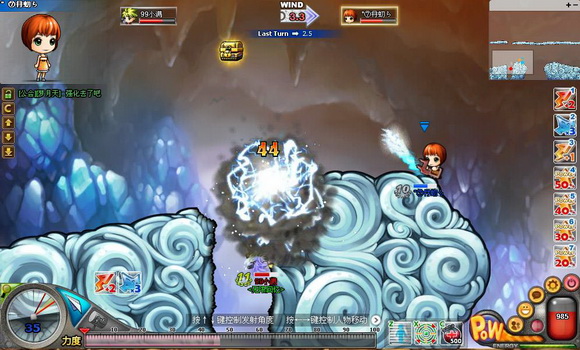 战斗则需要使用键盘操作,“↑↓键”:控制人物发射炮弹的角度,左下角有显示炮弹发射角度的刻度。“空格”:控制炮弹发射的力度,按住空格的时间越久,炮弹发射的距离越远。在最下面的“Power”刻度条,会显示当前空格操作所产生的力度。除了多个按键结合操作,战斗过程还要考虑到风向和风速,障碍物以及地方使用的技能等等。