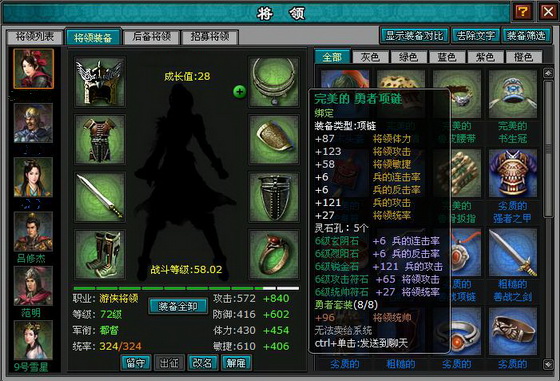 在将领统帅成长系统出来之前,大家所带兵力都由将领等级,统帅灵石以及勇者套装来决定,将领等级升高和所带兵力在低等级变化较大,到了60多级,升级超难,而且升级给将领统帅能力带来的好处并不是很大,升一级将领统帅也就多2个。而统帅灵石镶嵌也能小范围的提升将领的带兵数量,巧就巧在这种灵石只能镶嵌在饰品上。勇者套装是最好的一种途径,一套勇者大概能给穿戴它的将领多带100个兵左右,是破天荒的将领统帅能力提高。