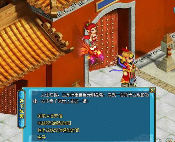 上图是每天在长安近卫统领都可以领取到的1小时双倍经验神丹,它和商城里买来或者兑换得到的双倍经验符有完全一样的功效,时间都是一小时,经验加成都是2倍。每天到野外刷怪势必少不了这两个法宝了。在我们使用双倍经验符之后,往往有很多突发事件要我们去处理,有时候被好友拉去做任务,有时候相回城买东西或者卖东西……此时回城多么浪费双倍时间啊?怎么办呢?其实这个问题是不用担心的,长安城的近卫统领,每天都可以领取双倍丹的NPC可以冻结双倍时间,也可以随时为你回复你的双倍时间。