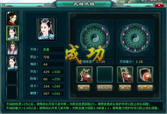 资质成长更刺激和危险,一旦失败就从零孔重来,潜力成长只会掉到第五孔。因此,资质成长分两个阶段,能突破六是第一阶段,满孔为第二,其中第五孔,第六孔,第七孔和第九孔最容易失败,需要在这几个地方缓一换,或者使用保护丹,失败了也不用从零开始。
