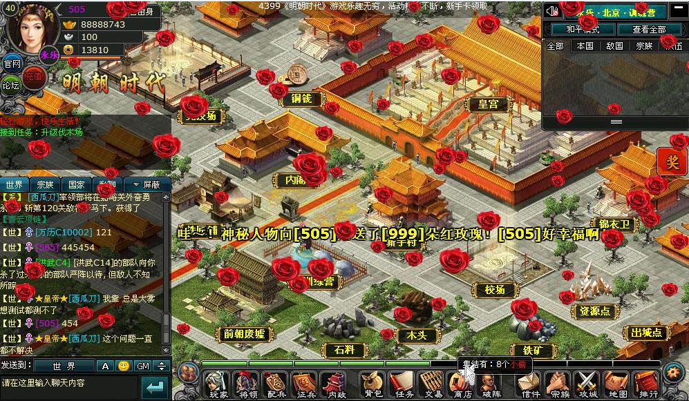 4399明朝时代是时下最流行的一款免费网页游戏,受到广大游戏玩家的热捧,并且人气持续高涨,4399明朝时代游戏不但向广大玩家展现了这个中国历史上强大的专政王朝的内外政治和民俗民风;更有精彩的游戏内容,独特的英雄个人主义加策略结合的游戏系统设置,让玩家迷恋其中。而游戏里鲜花系统满屏飘花的画面也独树一帜,受到众多玩家的喜爱。