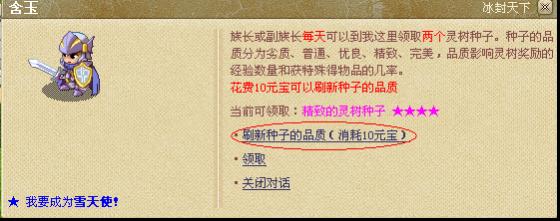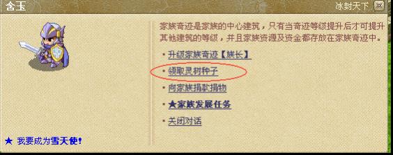 1、进入家族地图,可由族长或者副族长领取灵树种子,SP:高品质的种子种植后可获得高经验加成并且可刷新。