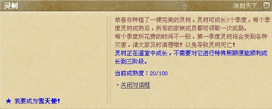 随着迷雾森林的树木被各种老鼠的破坏日趋严重,使得整个刃雪城的绿色环境受到大大的创伤,刃雪城城主空明寻访世界各地,终于寻得大量的灵树种子,可是这种树木不易种植,并且在种植过程中会出现大量的病变,如果不及时处理,将会导致该种树木的死亡!于是城主空明向各大家族发出通告,如果能帮助种植该种植物的家族,所有成员都可获得大量奖励,于是一股种树热潮就在各个家族中展开了!