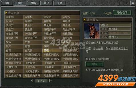 商城机构中的另一个部分,银币商店,银币是游戏中的霸王,没有金币玩家们可以顺利玩到顶级,而缺少银币则寸步难行。4399玉之魂银币是通过成长任务,征收税务,买卖粮食,银矿,以其游戏的大型战争矿站等多种方式获得,游戏中没有任何方式可以将金币转化成银币。玩家日常所需的武器,披风,盔甲以及战马都要经过银币商店购买。