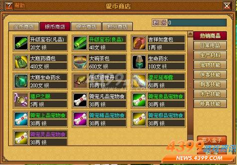 银子商店:银子商店中只可以使用银子购买物品。积分商店:在积分商店中使用在消耗金子购买物品后返还的积分兑换物品。