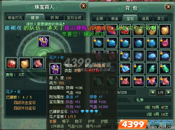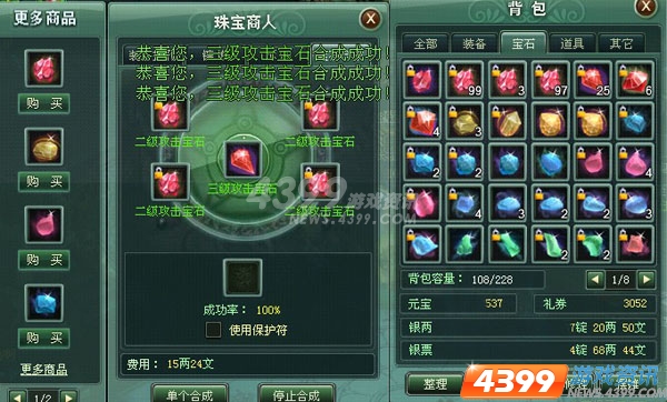 宝石的准备需要一个比较长的时间,刷副本,爬塔是获得宝石的绿色途径,每天两次刷塔可以获得4级或者5级各种宝石,此外,4399江湖令还专门为宝石积累开放了矿区,大家每天可以在矿区内采矿,将矿石打磨成宝石,合成高级,用于镶嵌。