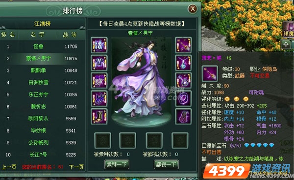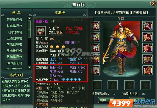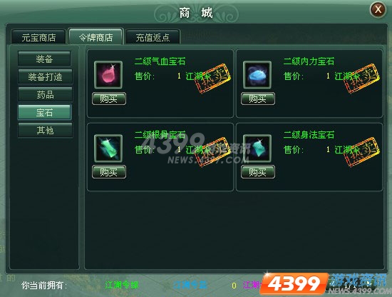 镶嵌宝石不在多,而在精,4399《江湖令》某些所谓英雄狂合宝石,凿通6空,乱镶一通,结果发现效果并不理想。没有根据本职业的特征来镶嵌相关宝石,镶嵌就起不到发挥自己专长的目的,想在武林世界做一个全能的侠客,是很不理智的。江湖令是4399游戏平台旗下梦幻修仙 、弹弹堂、凡人修真、英雄远征、御剑江湖、洪荒神话、明朝时代、明朝传奇、傲视天地、热血三国、战将风云、江湖令、大汉传奇、傲视千雄、九天仙梦、藏域、幻龙战记等精品系列中最受欢迎的武侠佳作,精彩世界大家共同拥有。