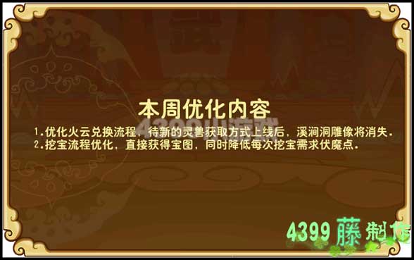 1.优化了溪涧洞火云兑换流程,小侠士可以直接选择走后门进入雕像和四大侠士切磋,胜利后出现宝箱,用灵溪花和魔石即可打开宝箱。下周溪涧洞雕像将消失,请侠士们耐心等待新的灵兽获得方式哦。