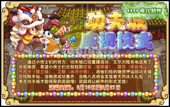 上古巨蜥刚刚大闹完功夫城,功夫城重建成功,现在要开始庆祝狂欢了,小侠士们一起加入到功夫城来吧!大家一起来看看功夫派6月15日攻略的预告:)