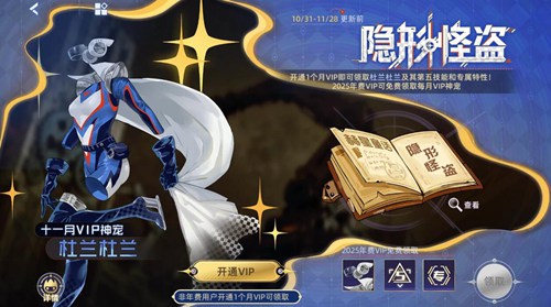11月包月精灵杜兰杜兰登场,开通1个月VIP即可在活动期间领取杜兰杜兰、专属特性和第五技能,年费VIP可直接领取!