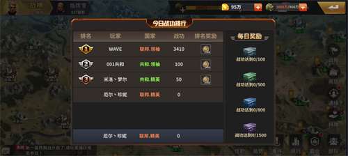 排行榜记录了今日所有阵营的玩家参与国战获得的战功,根据战功排名,每日还会发放排名的荣耀币,荣耀币可在国战商店兑换所需物资,除每日排名奖励外,还有每日战功到一定程度即可领取的每日宝箱奖励,获取一定的游戏资源。