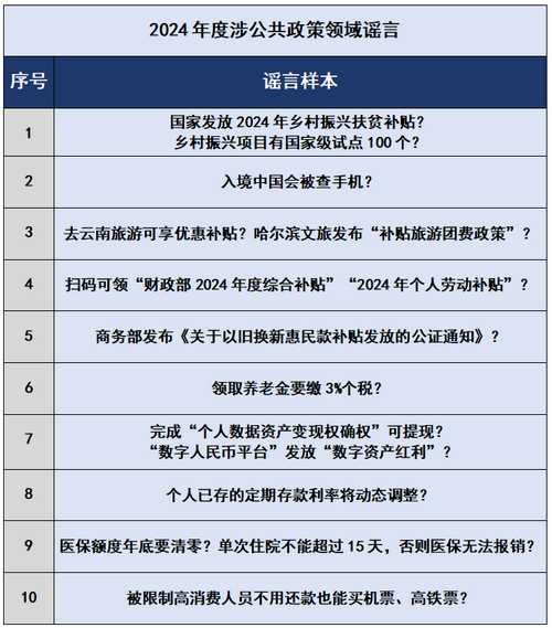 2024年3月,有不法分子冒用国家机关名义,假称“国家发放2024年乡村振兴扶贫补贴”“乡村振兴项目有国家级试点100个”,以高额返利为诱饵,引诱大量不明真相的群众加入所谓的各类“基金会”和“项目”,巧立名目骗取钱财。还有自媒体从公开发布的政策信息中摘取碎片化信息,断章取义,对政策歪曲解读。如2024年10月,个别自媒体故意混淆“个人养老金”与“基本养老金”的概念,传播“领取养老金要缴3%个税”“养老金个税起征点为5000元”等不实信息,引发公众误解。此外,在《国家安全机关行政执法程序规定》和《国家安全机关办理刑事案件程序规定》公布之际,一些别有用心之人借机造谣抹黑、搬弄是非,大肆炮制所谓“入境中国都会被查手机”的谣言,荒谬至极。