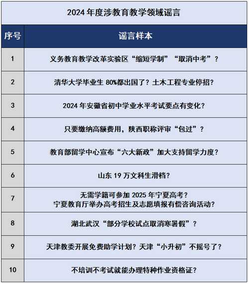 涉教育教学领域谣言利用广大学生和家长对中招高招、学制改革、留学教育、求职招聘等信息的关切心理,在“招生”“考试”“寒暑假”等时间节点,散布不实信息,引发学生和家长不必要的教育焦虑,扰乱正常的招考秩序。