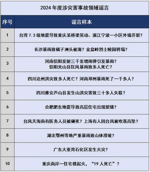 2024年4月初,台湾花莲县海域发生7.3级地震后,有网民编造“地震导致重庆某桥梁晃动”“浙江宁波一小区外墙开裂”等谣言混淆视听,引发恐慌。2024年汛期,暴雨、台风接连来袭,全国多地灾情严峻,个别自媒体和网民为博取关注、吸引流量,或夸大其词,或移花接木,或无中生有,借机发布“河南信阳发射三千发增雨弹引发暴雨”“长沙暴雨致橘子洲头被淹”“四川达州洪灾致多人死亡”“河南邓州暴雨死了一千多人”“台风天海南有医务人员被砸死”“上海有人因台风被吹落高坠”等不实信息,引发群众恐慌,造成不良社会影响。此外,谣言“广东大亚湾石化区发生火灾”则是利用人们对人身财产安全的重视以及对环保安防设施“火炬”(一种高温燃烧装置,石油化工企业用于保障生产稳定、减少环境污染的安防设施设备)的不了解,蓄意制造焦虑,扰乱社会秩序。