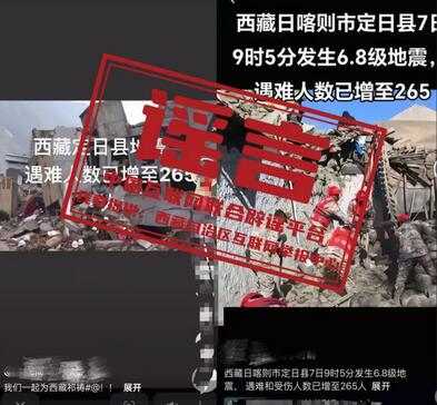 真相:2025年1月7日9时5分,西藏日喀则市定日县发生6.8级地震,震源深度10公里。截至1月9日上午6时,官方正式公布此次地震已造成房屋倒塌3612户,遇难126人。该数据是目前唯一可信的遇难人数信息。然而,近日网络上却出现一些别有用心之人,故意编造并传播虚假信息,声称地震遇难人数为265人,这与实际情况严重不符,属于毫无根据的谣言。