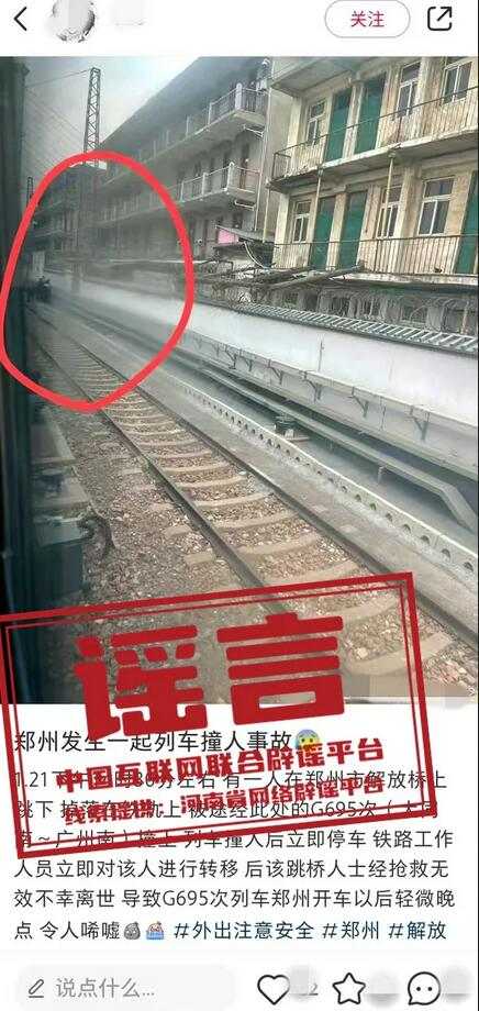 真相:近日,网传“有人在郑州解放桥跳下被火车撞伤,导致列车晚点”。经核实,网传内容不实。郑州铁路站1月22日发布辟谣消息称,经核实:2025年1月21日14时32分,一男性下车旅客擅自从郑州站站台北端进入线路岔区由南至北行走,车站工作人员跟随劝说无效,紧急通知即将进站的G695次列车临时停车避让,未出现相撞和人员受伤。随后相关部门将其控制并带离。经医院诊断,该男子被确诊为“精神障碍”疾病。(来源:“清朗河南”微信公众号、顶端资讯)