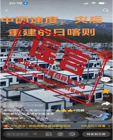 详情:西藏定日县6.8级地震发生后,不少自媒体账号为了博眼球,在互联网上散布地震不实信息,并在网上进行传播,严重影响了社会公共秩序。近日,有网民在某视频平台发布“中国速度,灾后重建的日喀则”文字信息,并配有“某地集中安置活动板房”视频画面,疑似涉嫌利用日喀则市定日县地震不实视频,博眼球、蹭流量,获取网民关注。经日喀则市、定日县网信部门核实,该信息不属实,视频显示地不属于日喀则市灾区安置房。目前,该用户已经删除该视频。(来源:“西藏举报”微信公众号)
