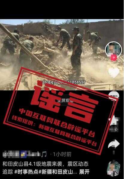 真相:中国地震台网正式测定,2025年01月23日11时45分在新疆皮山县(纬度36.94°,经度78.87°)发生4.1级地震,震源深度15公里,震中附近地形类型为山地,5公里范围内平均海拔高度为2484米,距离皮山县92公里。个别网民关联此次地震,发布“房屋倒塌、道路坍塌及应急救援”等谣言图片和短视频,博取流量误导网民。经皮山县应急管理局核实,此次地震未造成人员伤亡及财产损失。对编造散布地震谣言扰乱公共秩序、造成恶劣社会影响的行为,公安机关将依法依规严肃查处。请广大网民擦亮眼睛,勿轻信传播非正规来源、未经证实的地震信息。(来源:新疆网络辟谣)