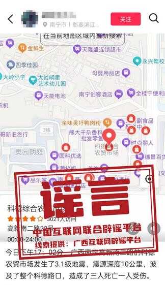 真相:2月12日,有网民在某短视频平台发文称“今日下午17:02分,广西南宁高新南二路的科德农贸市场发生了3.1级地震。”经向有关部门核实,此信息为谣言。据广西地震台网和南宁市地震监测中心数据显示,南宁市及其邻区无有感地震发生,亦无震情和灾情信息反馈。目前,谣言线索已转交相关部门对造谣者进行进一步调查处置。(来源:“广西互联网违法和不良信息举报”微信公众号、南宁市互联网举报·辟谣平台)