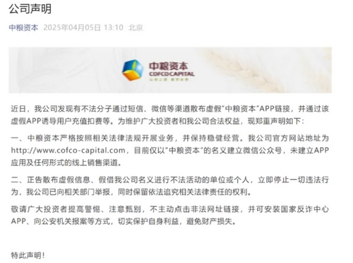 详情:中粮资本4月5日发布声明称,公司发现有不法分子通过短信、微信等渠道散布虚假“中粮资本”App链接,并通过该虚假App诱导用户充值扣费等。中粮资本强调,目前仅以“中粮资本”的名义建立微信公众号,未建立App应用及任何形式的线上销售渠道。