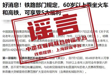 真相:近日,网上有信息称:“中国国家铁路集团有限公司在5月17日曾发布文件,明确自7月1日起,60-69岁老年人可享受除法定节假日和暑运高峰期外的火车票七折优惠;70岁以上老年人则可全年享受六折优惠,且不受节假日和暑运限制。”经核查,上述网络传言不实。国铁集团所有官方信息发布渠道都没有发布所谓《关于优化老年人铁路出行服务的实施意见》的文件。中国铁路12306客服也回应称,中国铁路未发布过上述文件,目前60岁以上老人购票暂无折扣优惠。进一步溯源发现,相关信息大概率为自媒体或营销号利用AI软件生成,其利用老年人的出游意愿以及对车票信息的关注度,使用AI大模型编写虚假信息,依旧是“博眼球,拉流量,变现谋利”的套路。(来源:“上海网络辟谣”微信公众号)
