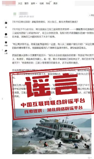 详情:日前,多家媒体援引中国城市公共交通协会网约车分会消息称“北京燃油车彻底禁入网约平台”。7月23日,中国城市公共交通协会网约车分会发布道歉声明称,7月22日,由《中国网约车分会》公众号发布的每日简讯中关于“北京燃油车彻底禁入网约平台”的信息,由于未经权威部门核实,给公众造成了误导。目前,该条消息已经做了撤架处理。根据现行《北京市网络预约出租汽车经营服务管理实施细则》,在本市申请办理《网络预约出租汽车运输证》的车辆,需符合的条件并未涉及燃油车禁入的有关限制,北京市内运营的各大网约车平台也并未发布官方通知。(来源:“北京网络举报”微信公众号、“北京资讯广播”微信公众号) 谣 言 湖北宜昌游船突然倒扣、30人坠江?