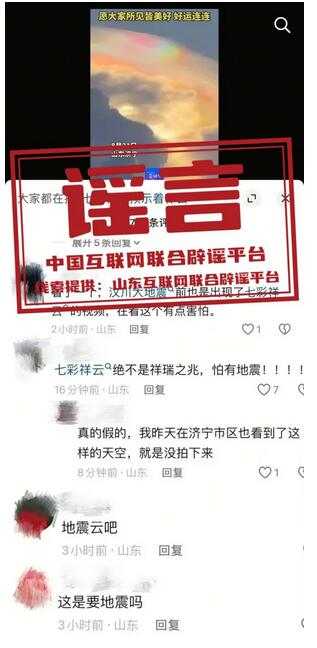 谣 言 山东济宁出现“祥云”为地震前兆?