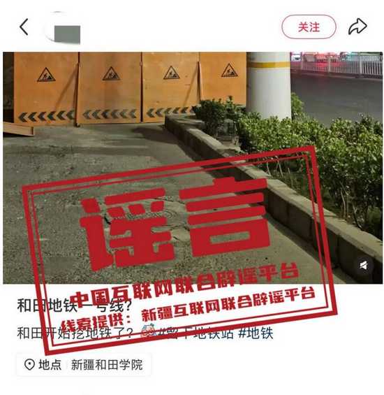 详情:近期,有网民发布视频称“中国籍女子嫁到外国贫民窟,被丈夫扣留护照无法回国,中国博主与该女子偶遇后,该女子希望博主解救其回国”,并在评论区持续误导网民这是真实发生的情况,引发广泛关注。经核查,该信息纯属虚构。杨某某(男,22岁)伙同其女友陈某某(女,25岁)为博取关注、吸粉引流,以直播带货、牟取利益,共同策划、拍摄该虚假视频并在网上发布。目前,公安机关依法对杨某某、陈某某分别处以行政处罚。(来源:“公安部网安局”微信公众号) 谣 言 新疆和田开始修建地铁?