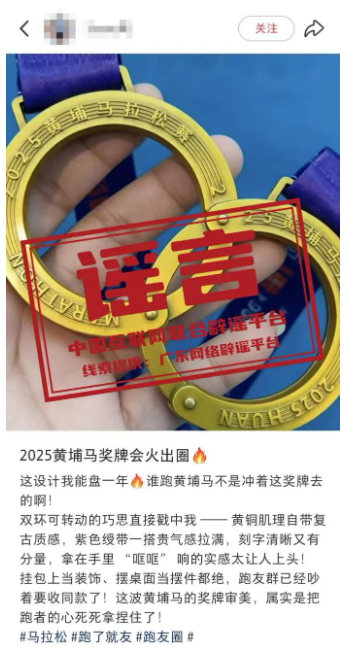 详情:近日,网传“2025黄埔马拉松完赛奖牌为手铐型”消息引发关注。对此,2025黄埔马拉松赛官方组委会回应称该信息不实,网传图片系P图或AI生成。据悉,2025黄埔马拉松完赛奖牌为圆环结构,其设计灵感源于精密齿轮轴承,致敬黄埔深厚的制造业根基。奖牌中央的圆环内圈镌刻的开拓者雕像、科学城地标、知识城九龙湖等图案,在同轴转动时可交替显现,宛如一条缩微的“城市发展能量带”,隐喻着个人拼搏精神与城市前进动力的同频共振,实物并不能如网传图片那样打开并呈现“手铐型”。(来源:“广东省互联网举报中心”微信公众号、南方网)