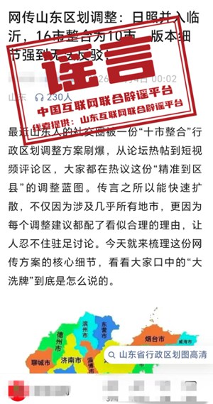 真相:近日,网传“山东区划调整:日照并入临沂”相关信息,引发关注。经向日照市民政部门核实,目前未收到上级关于日照市县级以上行政区划调整的通知,网传信息系谣言。(来源:“山东互联网联合辟谣平台”微信公众号) 辟 谣 “好友太多会被封”?微信辟谣!详情:近日,网络流传一则关于“腾讯微信朋友圈新规”的消息,其中提及“好友数量过多会被封号”“长期定位在同一地址会被封号”等说法,引发广泛关注。对此,微信安全中心回应称,所谓“腾讯微信朋友圈新规”纯属谣言,微信官方从未发布过任何“封号新规”,“好友太多会被封”“地址不变会被封”等说法更是无稽之谈。微信不会限制用户正常的社交行为,也不会因用户正常使用而处置账号。
