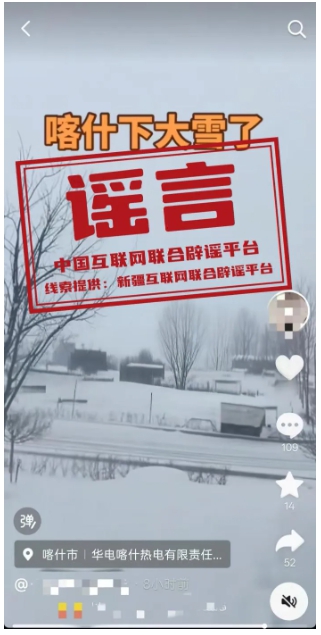 详情:3月11日,有网民在某短视频平台发布信息称“新疆喀什下大雪了”。经喀什市气象局核实,该信息不实,当日喀什市天气多云间晴,日最高气温18.7℃,最低气温6.9℃,出现5级以上西北阵风,无降雪天气。但该自媒体账号为博取流量,编造与事实不符的信息,混淆视听、误导网民,造成不良社会影响。目前,相关违法不实信息已全部下架。(来源:“喀什市网络辟谣”微信公众号)