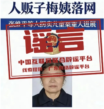 详情:近日,广州警方宣布“张维平拐卖儿童案”关键人物“梅姨”(谢某某)落网。不久后,一张标有警徽、配着所谓落网“梅姨”照片的图片在网络流传。经核查,该网传图片并非警方发布,所谓的“梅姨”照片为虚假照片。