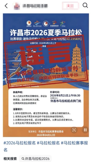 详情:近日,某平台账号发布关于“许昌市2026夏季马拉松”的赛事公告,引发关注。经河南省许昌市体育局核实,许昌市2026年度没有关于举办马拉松赛事的规划、申报及备案安排,确认该消息为不实信息。另据中国田径协会2025年12月19日公布的《2026年全国马拉松赛事目录》显示,河南省2026年计划举办5场马拉松赛事,均不在许昌市举办。(来源:“清朗河南”微信公众号、网信许昌)