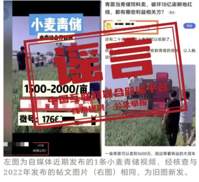 此外,河南郸城已查处一起传播“割青麦作饲料”的谣言案件。网民周某某通过在网上下载收割青麦的视频进行二次剪辑,并配上“一亩1500割了卖给喂牛再种秋玉米”的文字和声音,造成不良社会影响,已被公安机关依法行政拘留。(来源:“中国三农发布”微信公众号)