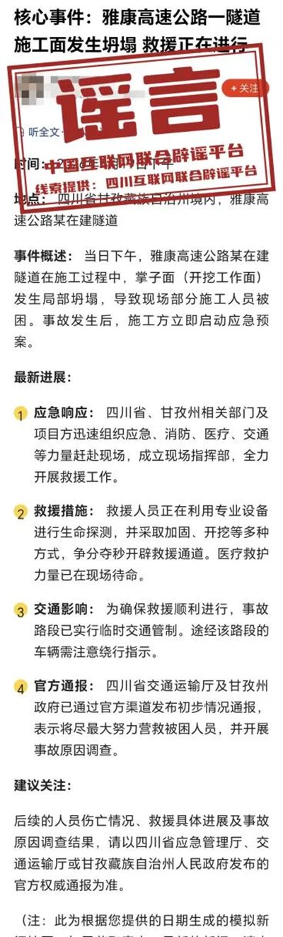 对此,属地应急部门回应未接到相关救援工作。属地交通部门回应,经全面核查,雅康高速在建隧道施工正常,未发生垮塌事故,更没有施工人员被困,网传消息系凭空捏造,纯属造谣。经进一步核查发现,网传“雅康高速公路一隧道施工面发生坍塌”音频及文字系AI生成的模拟资讯摘要。(来源:四川互联网举报辟谣平台、网视甘孜)