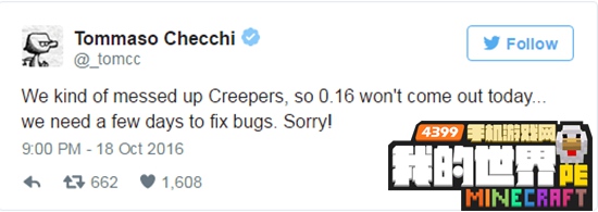 我的世界手机版由于0.16版本还存在众多BUG,为了给玩家带来更好的游戏体验,官方决定延迟发布时间(原发布时间为10月18日),请玩家耐心等待!!那么为什么我的世界pe0.16会延迟更新呢?和小编一起来看看吧,或者先下载测试版来玩一玩吧↓