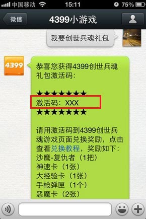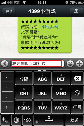 2、在4399小游戏微信中,文字回复“我要创世兵魂礼包”,就可以收到激活码哦!