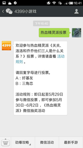 第二步:在4399小游戏微信中文字回复“热血精灵派投票”