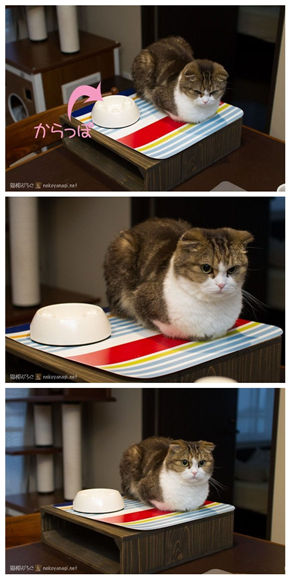 日本有只叫“猫柳”的猫咪,因为主人给的猫食份量不够,就把四肢统统收进身体底下,变成圆滚滚的猫包子,窝在空空的猫碗旁边,向主人静坐表示抗议!