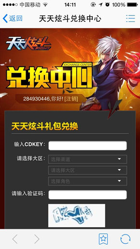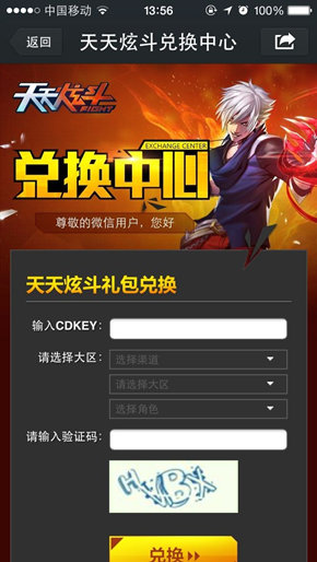 2、进入兑换中心后,按照提示输入CDKEY、选择大区(渠道、大区、角色)、输入验证码,点击兑换即可